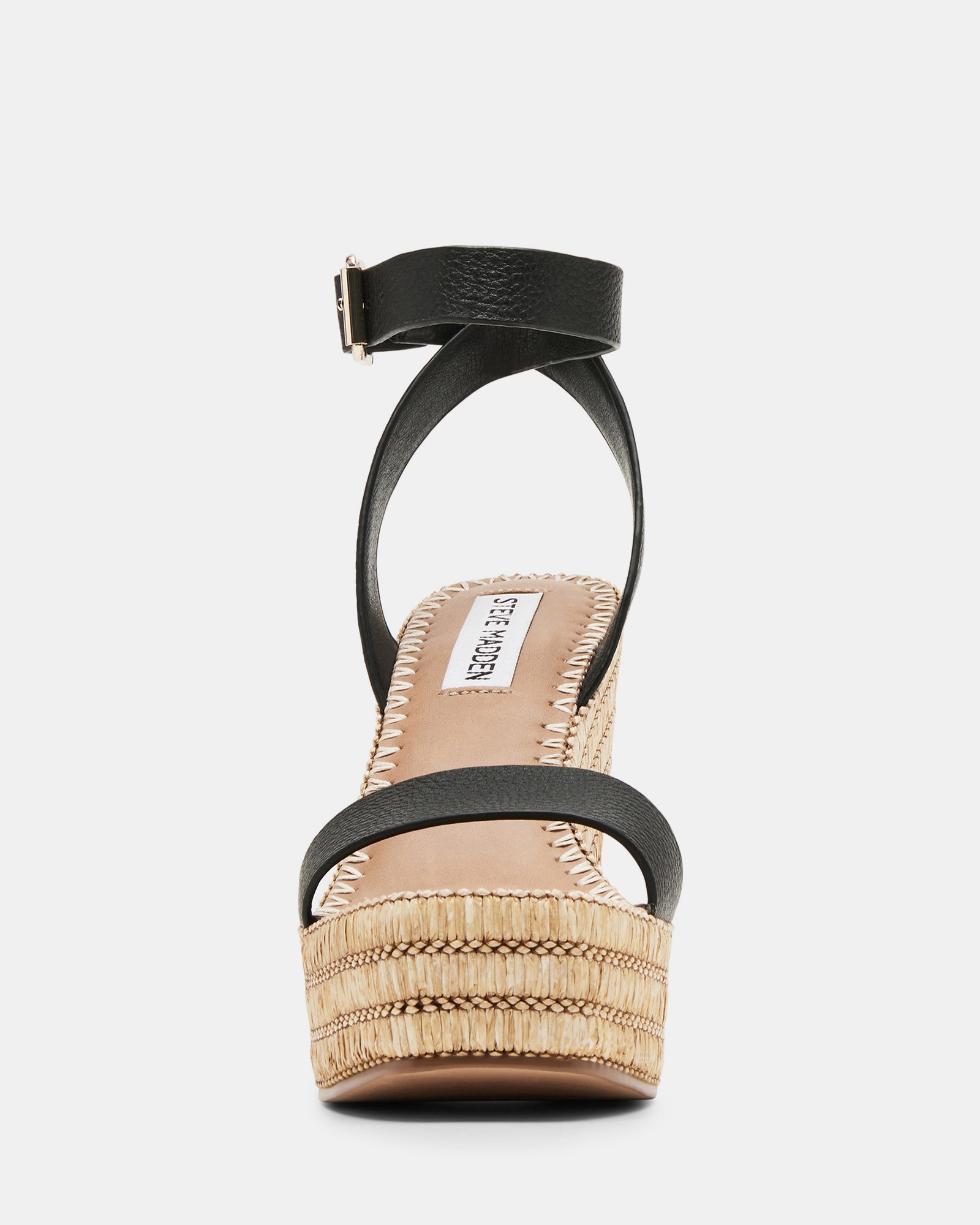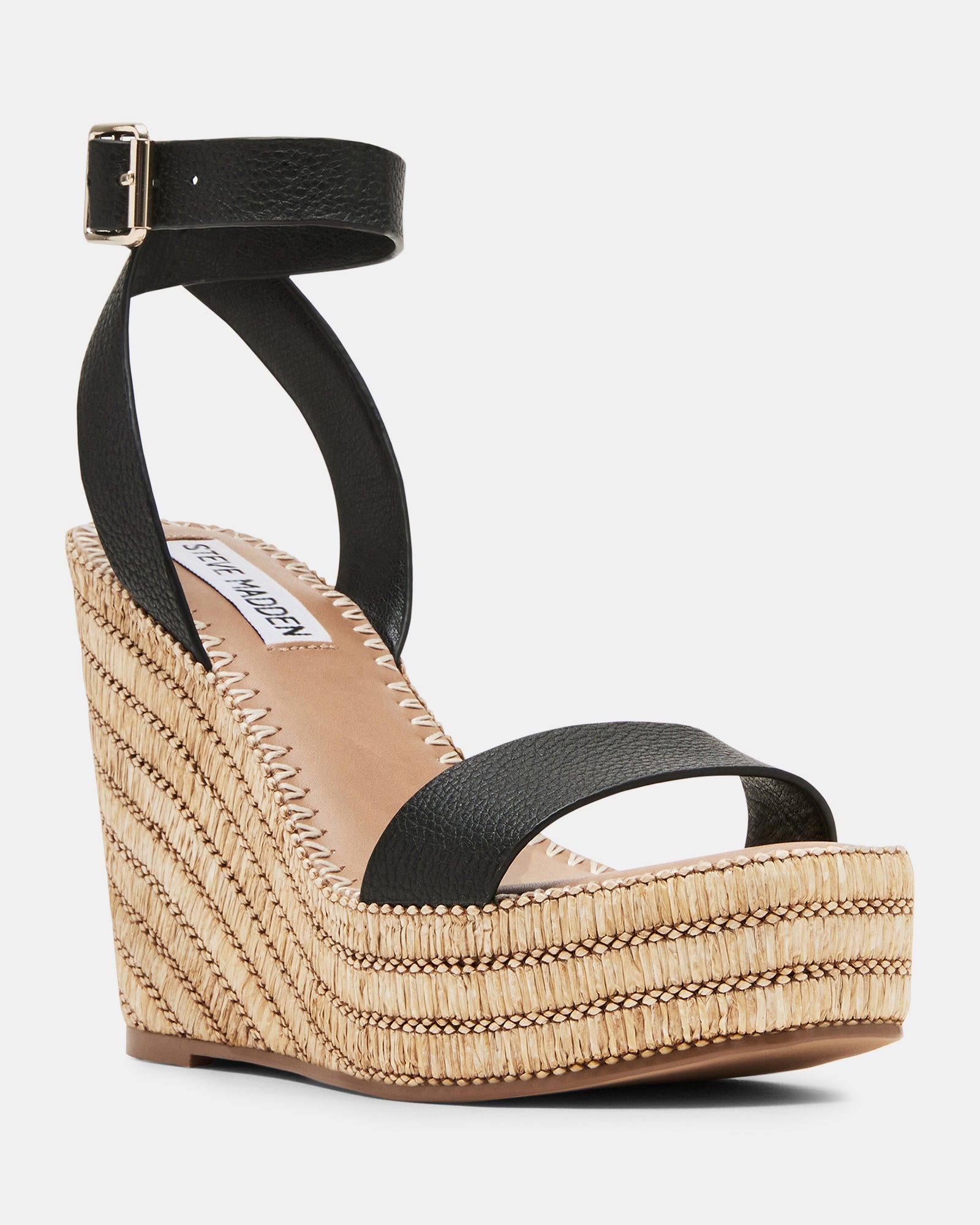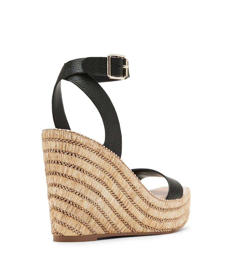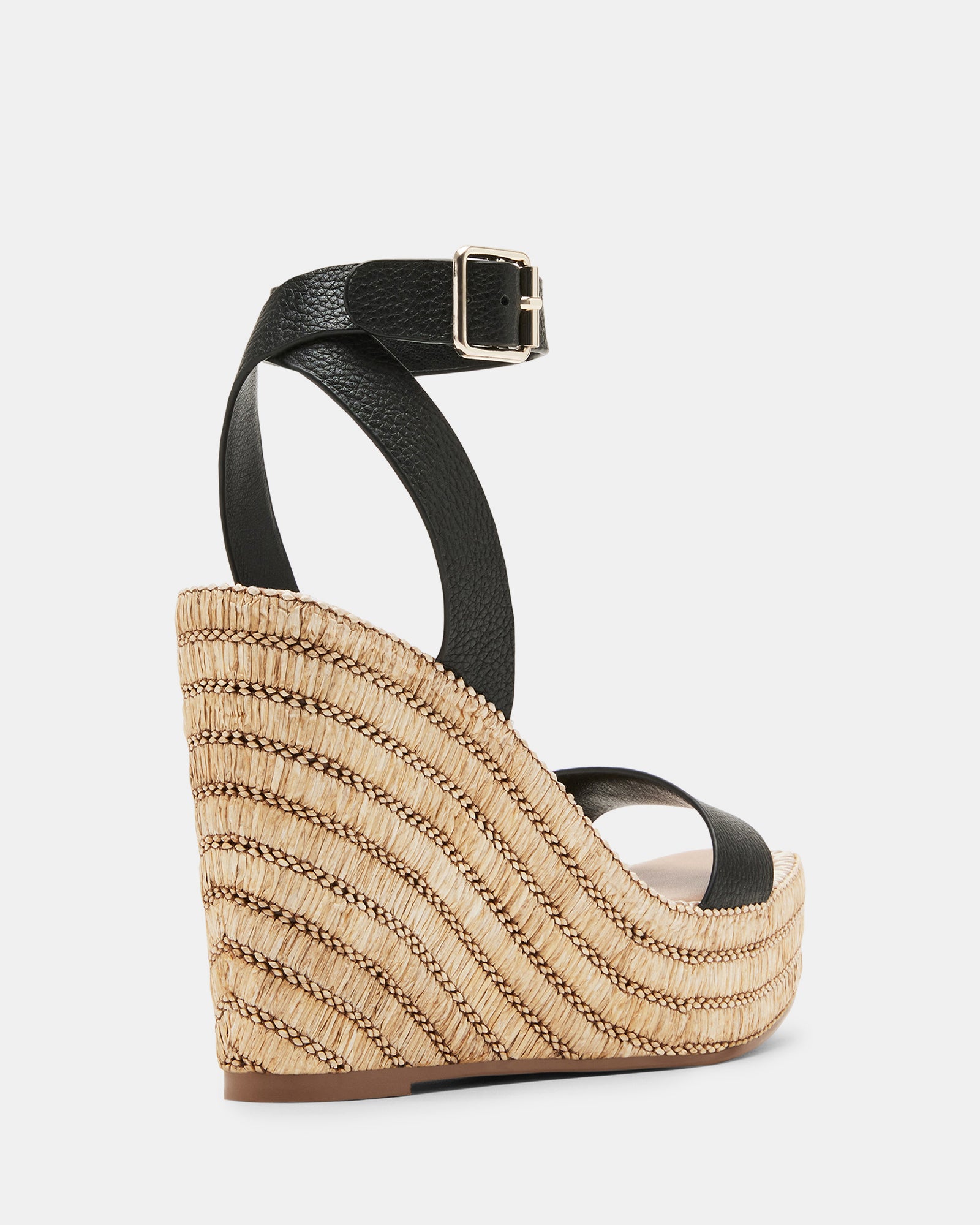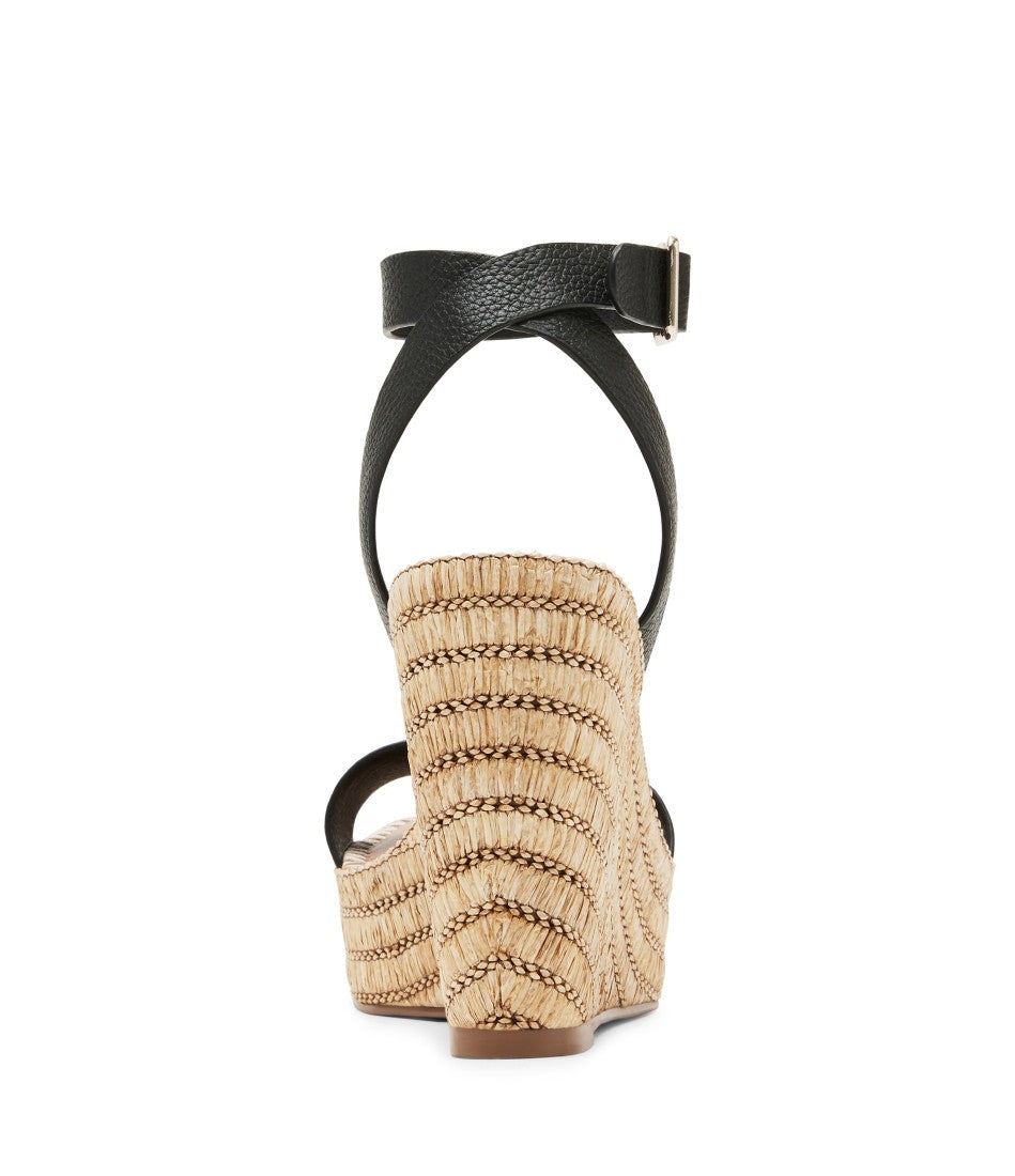 The CASSIE square toe sandal is set on a platform wedge sole wrapped in woven raffia in diagonal stripes and finished with whipstitching over the top.