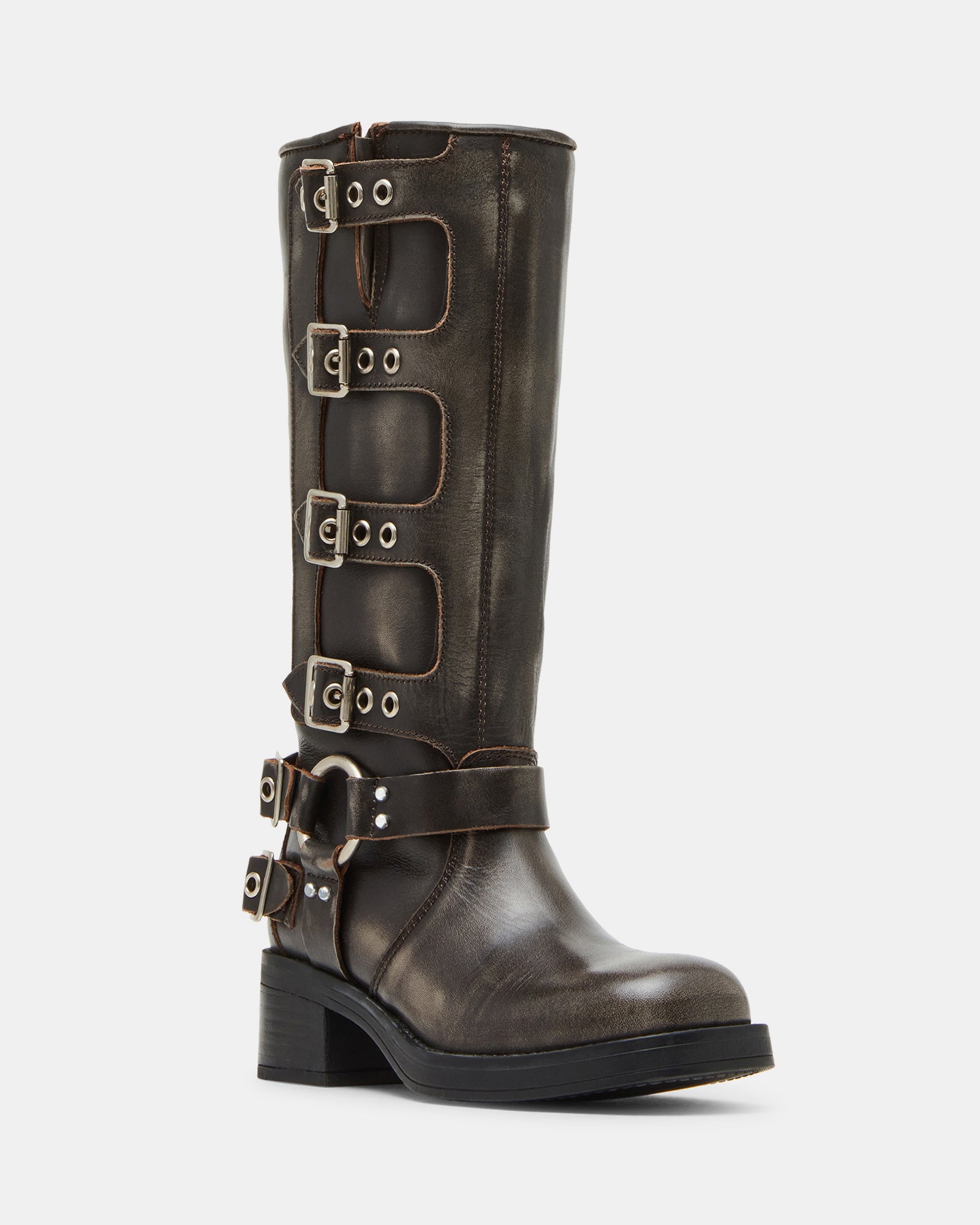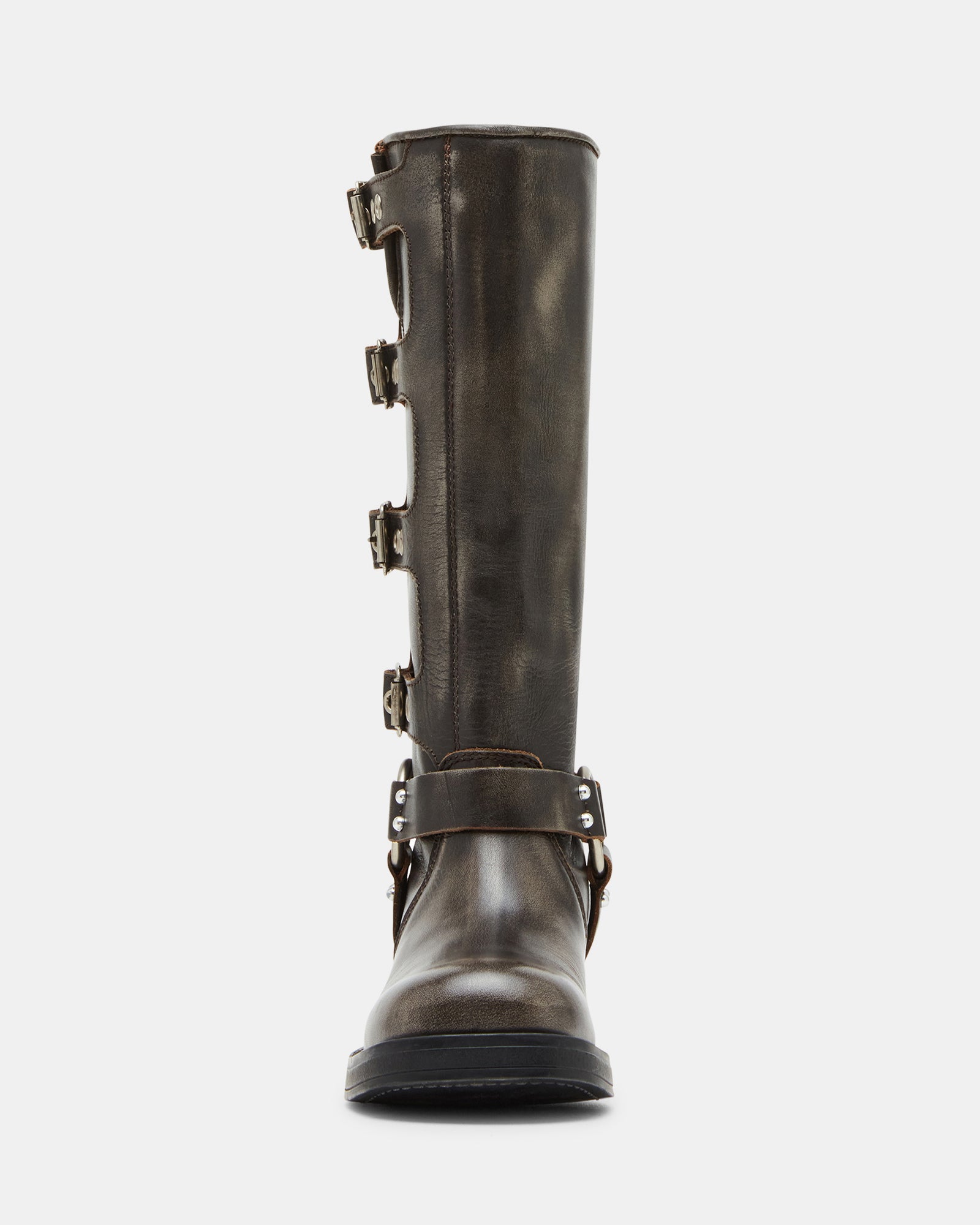 The Steve Madden ROCKY knee boot features the wide profile of an engineer boot with harness and buckle hardware adding an industrial edge and giving the design an adjustable fit.